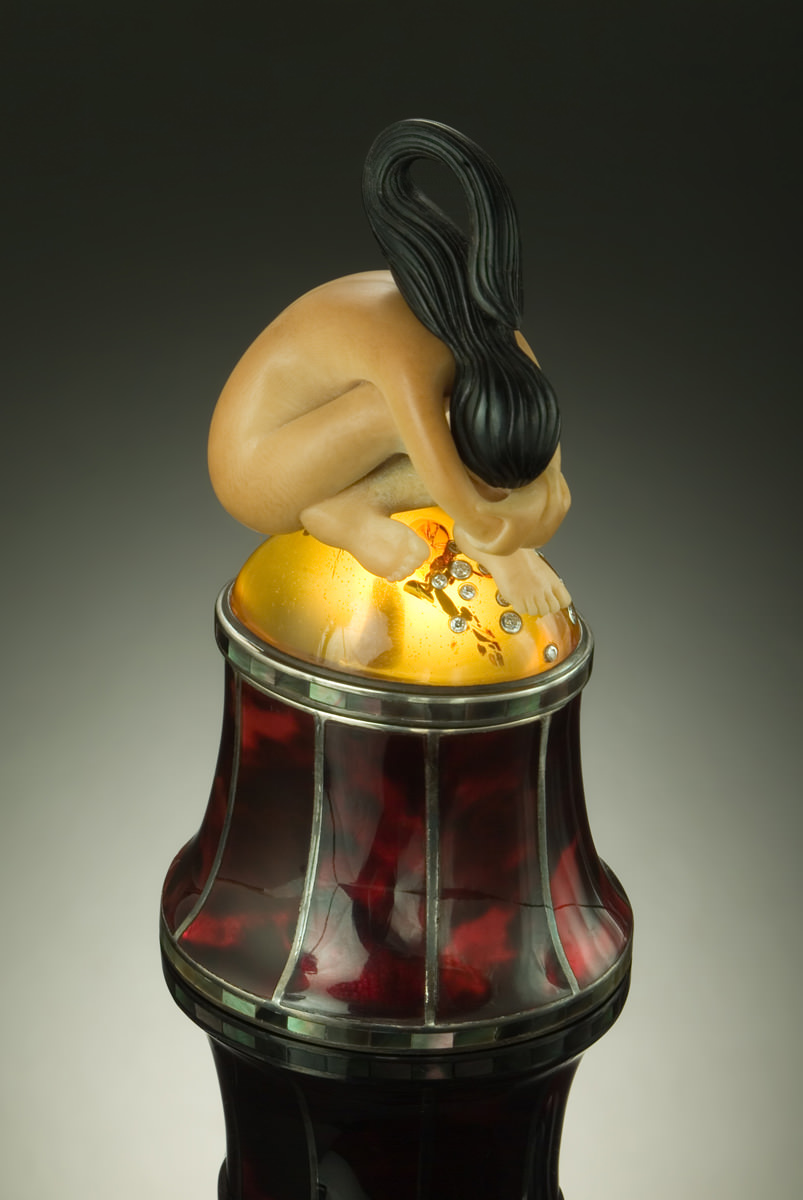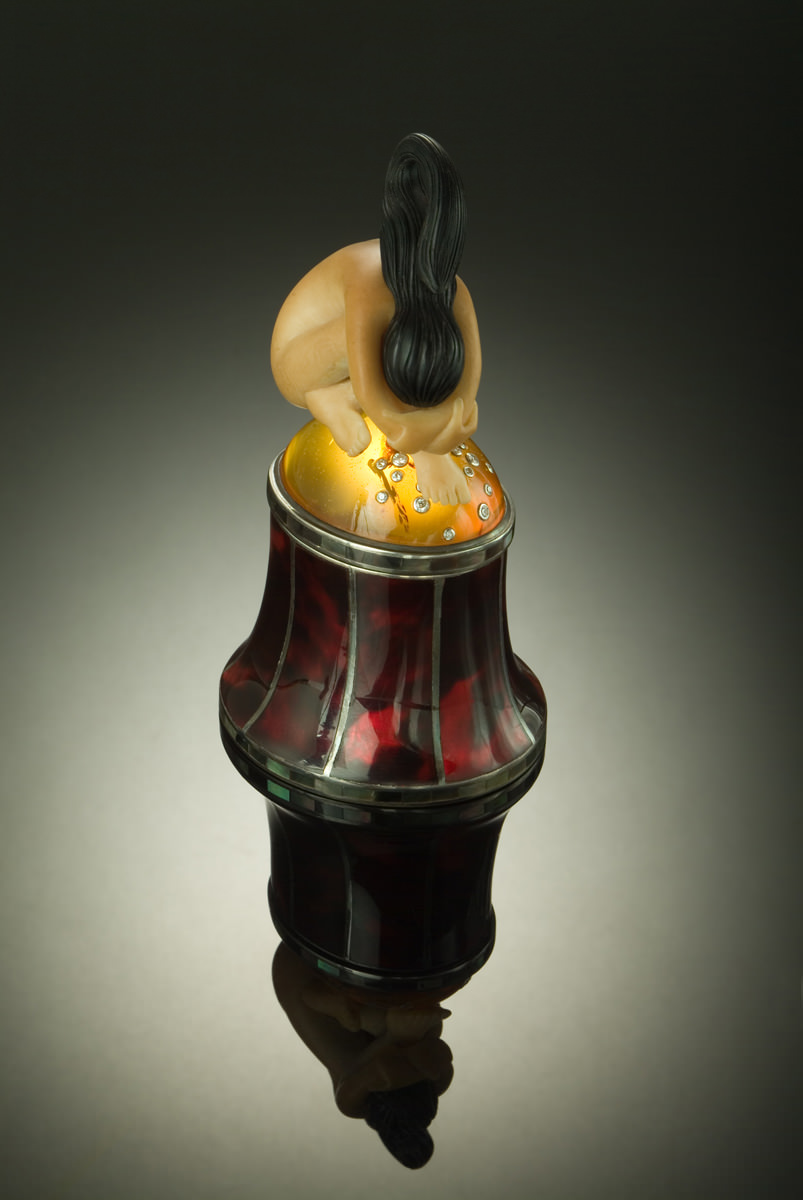 2006, H: 3″ Base: under-lacquered recycled turtle shell, mother-o’-pearl, silver. Lid: tagua nut, black coral, amber, diamonds, mother-o’-pearl, silver.